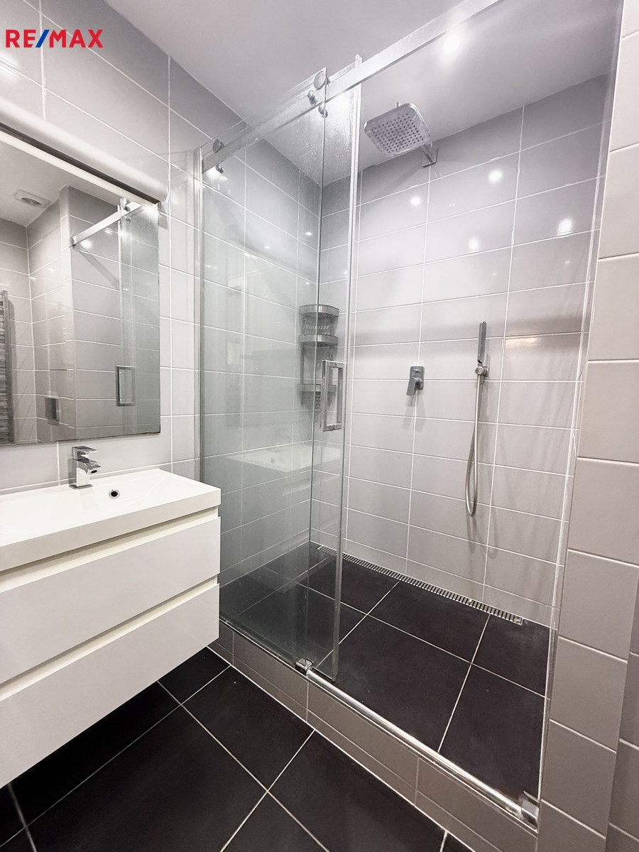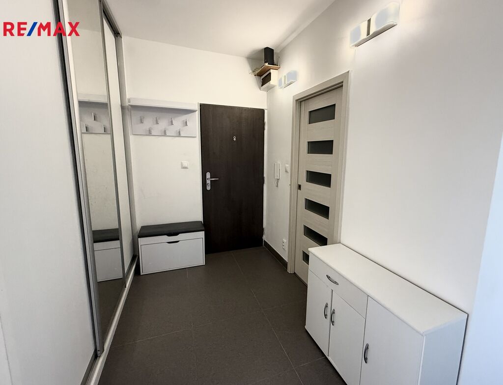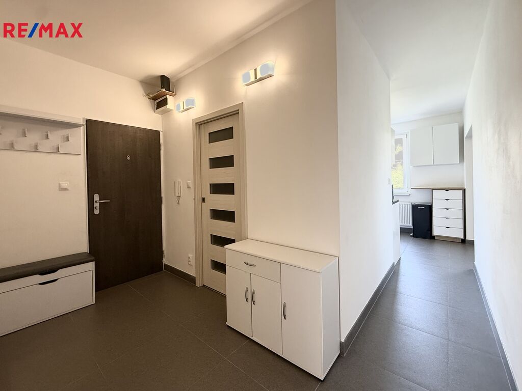 Byt se pronajímá vybavený dle domluvy. Skládá se z prostorné chodby s vestavěnou skříní se vstupem do dvou samostatných pokojů, kde se nachází dubové dřevěné podlahy. Dále pak plně vybavenou kuchyní se rozšířeným vstupem do obývacího pokoje s jídelním stolem. Zděná koupelna má prostorný sprchový kout.