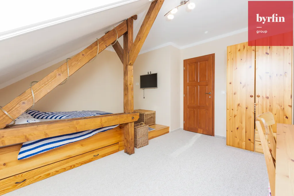 Druhá část mezonetu: Pokoj, ložnice , šatna a vstup na prostornou terasu, kde si můžete naplno užívat letních slunečných dnů.