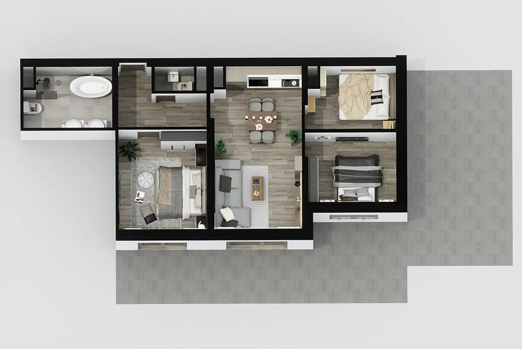 Máme pro vás jedinečnou příležitost: nový byt 4+kk v nejvyšším podlaží s prostornou terasou, odkud si vychutnáte slunce i klidné výhledy do zeleně.