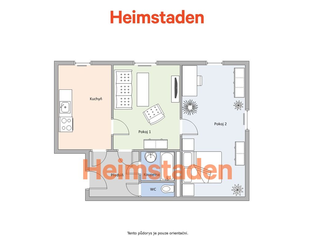 Z prostorné předsíně se vstupuje do kuchyně, koupelny s vanou a hlavního obytného pokoje, který tvoří srdce celého bytu. Ten je čtvercového tvaru, působí vzdušně a nabízí široké možnosti uspořádání interiéru.