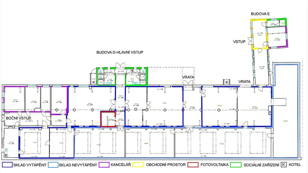 Vytápěné sklady: 390 m2, rozdělené na 7 částí