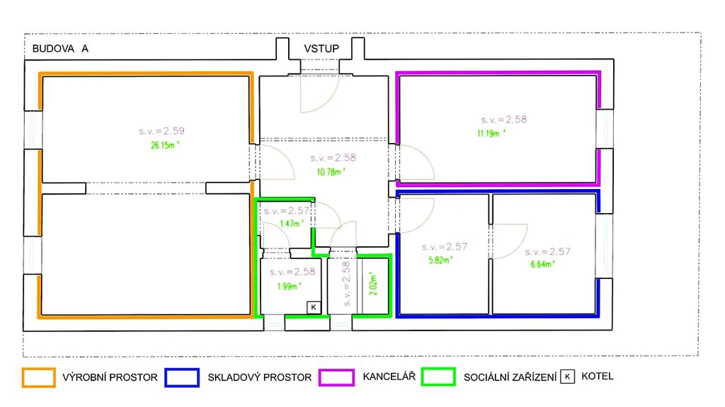 Hlavní plochy: výrobní prostor:26 m2, kancelář:11 m2, vytápěný sklad:12 m2