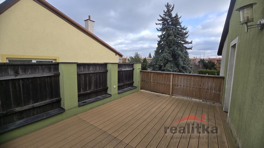 Nabízíme pronájem bytu 3+kk 85m2, s terasou 15m2 v Opavě na ul. Hořicova. Byt se nachází v 1. patře rodinného domu se samostatným vchodem. Ve vstupu se nachází menší veranda s odkládací stěnou a schodiště do 1. patra. V této části je obývací pokoj, ložnice, jídelna, kuchyň, koupelna a samostatné wc. Z obývacího pokoje je vstup na vlastní terasu, která má krásné soukromí. Dále je zde schodiště do mezonetového prostoru, kde je dětský pokoj se šikminami, jsou zde také úložné prostory a komora, kde je umístěn kondenzační plynový kotel.