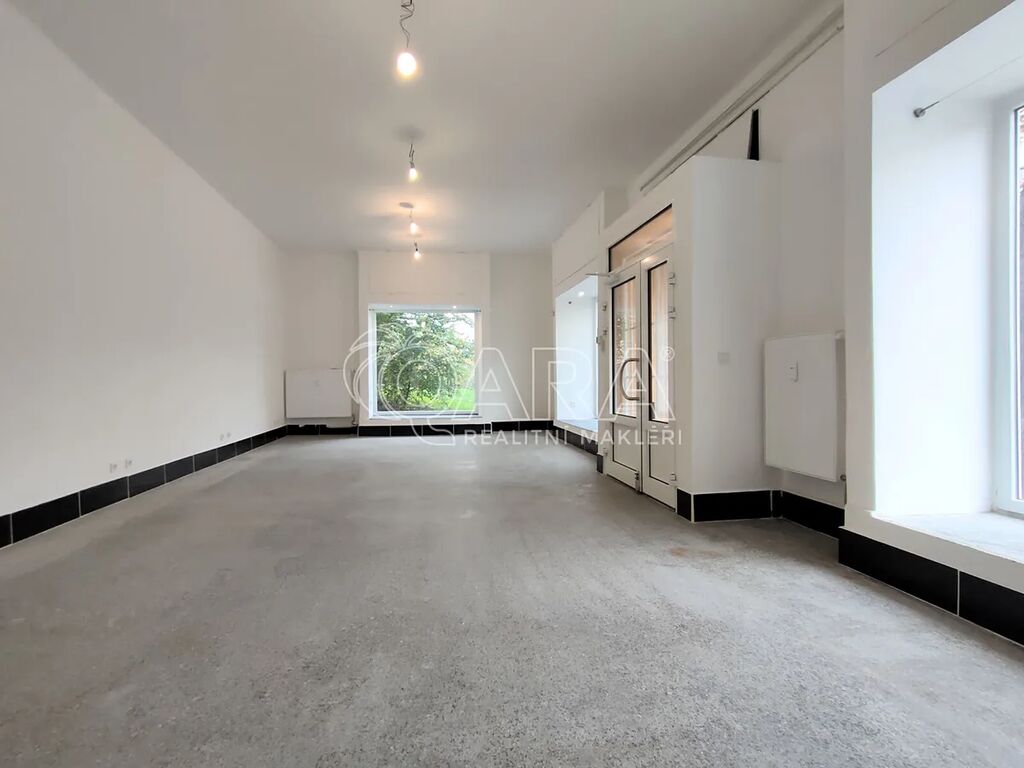 V principu jsou prostory rozděleny na dvě části. První má výměru cca 114 m2 a využijete ji jako obchodní, jelikož je umístěna v přízemí se dvěma vstupy z ulice a zároveň je vytápěná ústředním topením. Druhou část pak můžete využít jako sklad, ta je umístěna v suterénu a má výměru cca 44 m2. V zázemí je základní kuchyňka a toaleta.