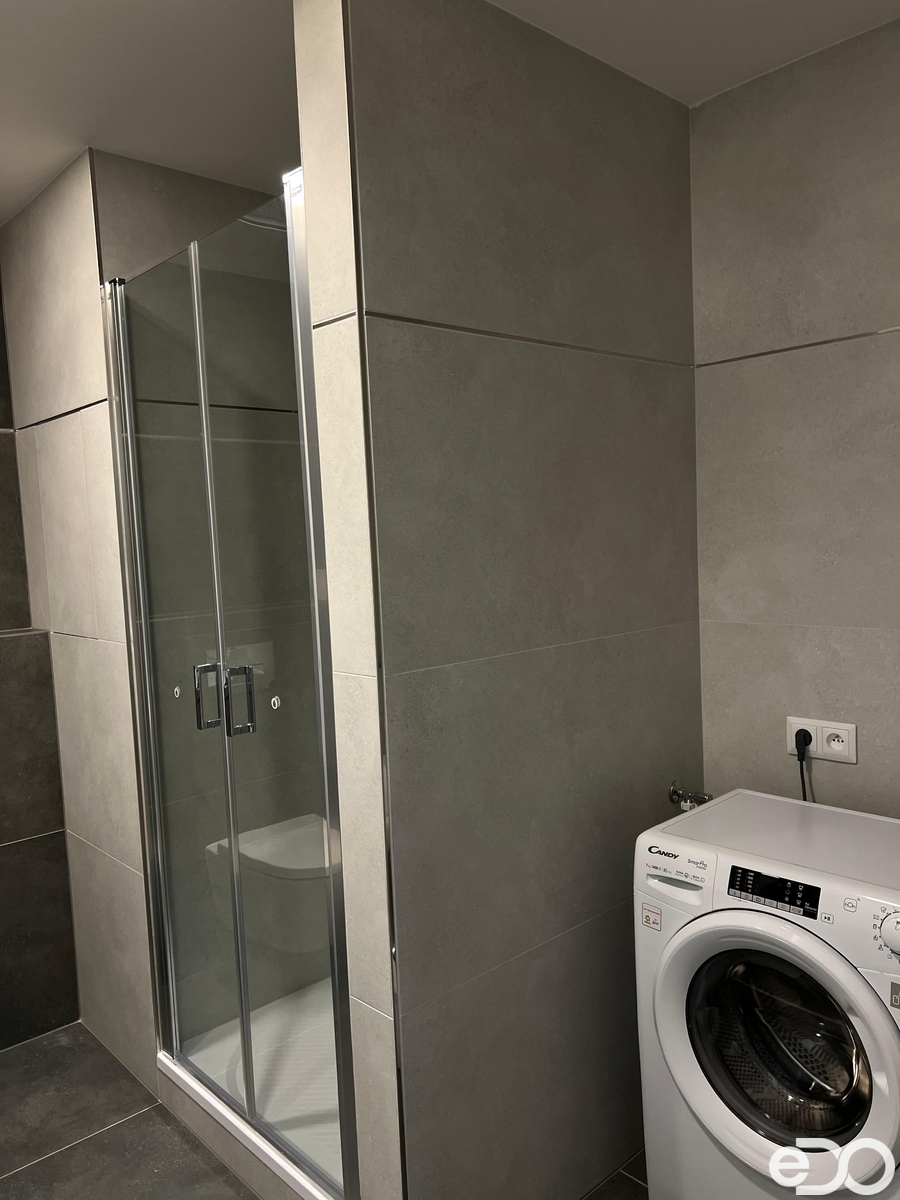 elegantní koupelna se sprchovým koutem, umyvadlem a pračka samozřejmostí,