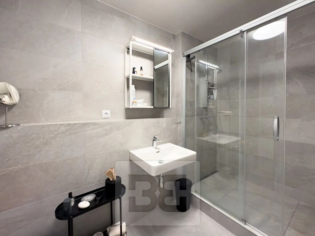 Koupelna je moderně zařízená, vybavená sprchovým koutem, umyvadlem a prostorem na pračku.