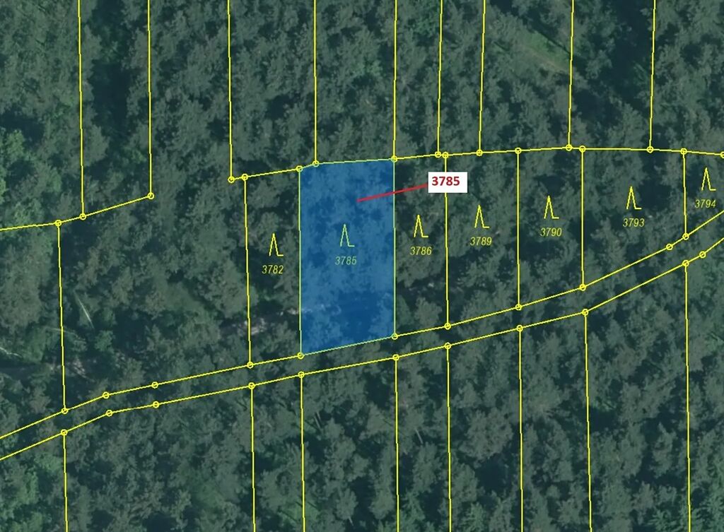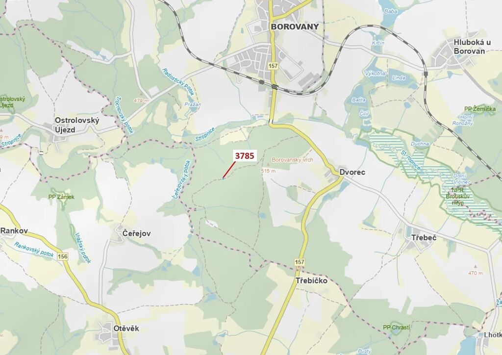 Lesní pozemek o výměře 605 m2, parcelní číslo 3785, podíl 1/1, katastrální území Borovany, obec Borovany, obec s rozšířenou působností Trhové Sviny, okres České Budějovice, Jihočeský kraj. Po těžbě.