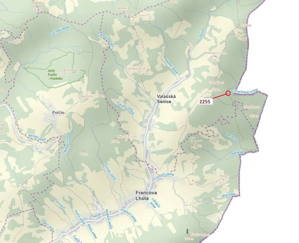 Lesní pozemek o výměře 917 m2, parcelní číslo 2255, podíl 1/1, katastrální území Valašská Senice, obec Valašská Senice, obec s rozšířenou působností Vsetín, okres Vsetín, Zlínský kraj.