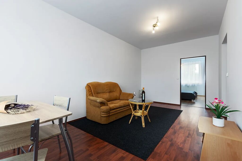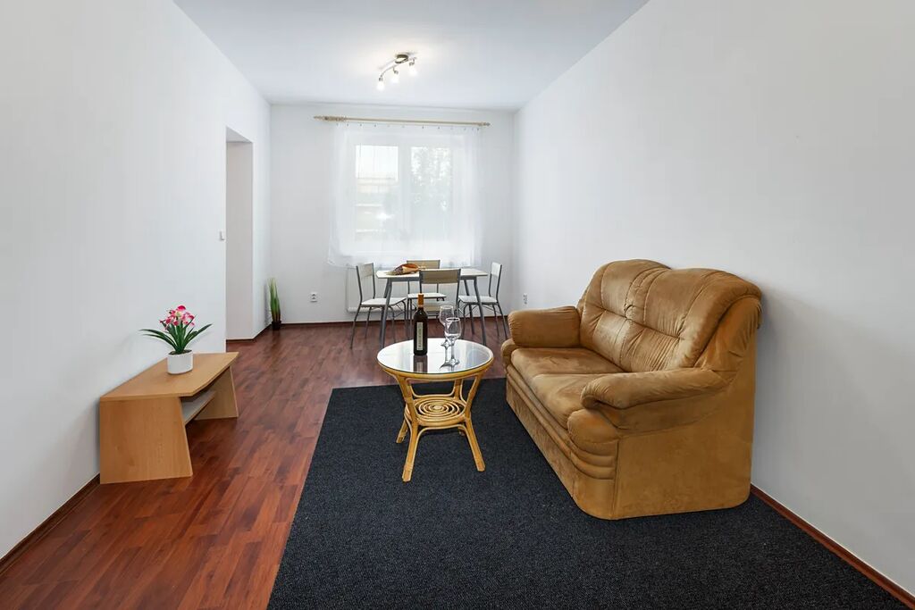 Dispozice bytu je 2kk, prostorný obývací pokoj s kuchyňským koutem, ložnice, samostatná koupelna a samostatné WC.K bytu náleží balkón, ideální pro relaxaci v létě a sušení prádla, dále sklep a dům disponuje také kolárnou a sušárnou.