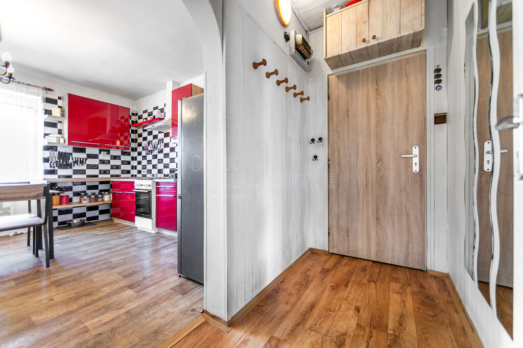 Dispozice je chytře řešená tak, aby obě ložnice byly neprůchozí. Ze vstupní chodby se vstupuje do ložnice a do kuchyně. Kuchyně je světlá, vybavená novou. Z kuchyně se jde do koupelny se sprchovým koutem, WC, umyvadlem a prostorem na pračku. Druhý vstup z kuchyně vede do obývacího pokoje a dále do další ložnice.