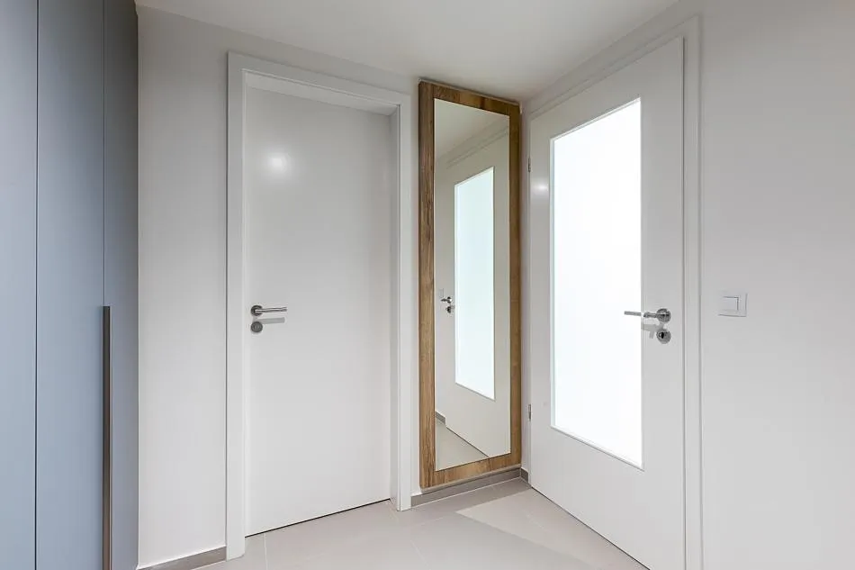 High-quality design and equipment, front window blinds, wooden windows with insulating triple glazing, large-format tiles, Laufen Pro sanitary ware, bidet showers, oak floors with underfloor heating, above-standard door height of 2.1 m, videophone, access to the building with a chip.