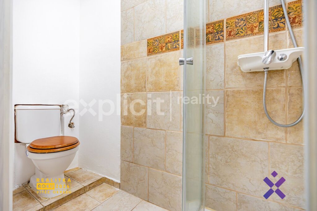 Koupelna je vybavena sprchovým koutem a toaletou; v chodbě je navíc umístěn topný žebřík a pračka.