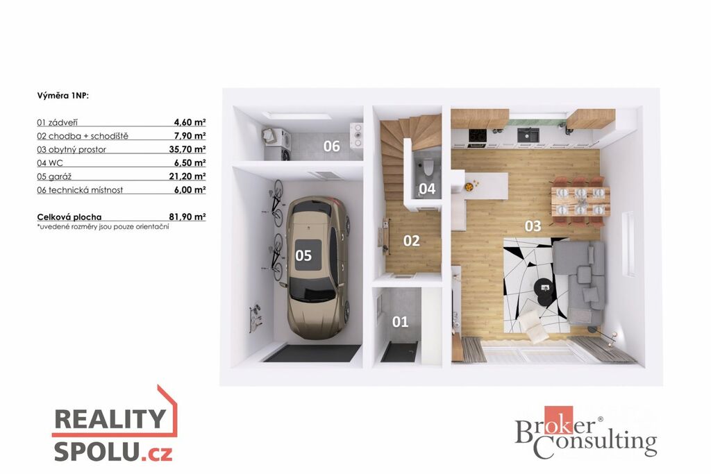 Dispozice: 5+kk | Podlahová plocha: 164,6 m² (včetně garáže 21,2 m²) | Pozemek: 439 m²