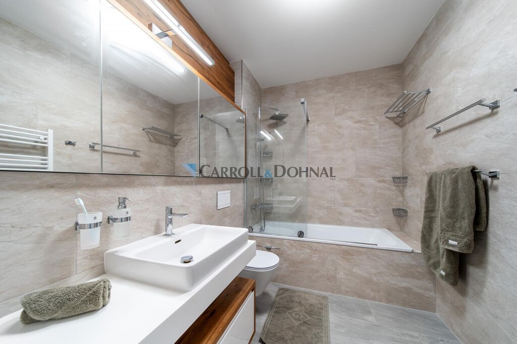 - vedle ložnice je designová koupelna s vanou, toaletou, doplněna skříňkami k uložení všech potřebných i nepotřebných drobností,