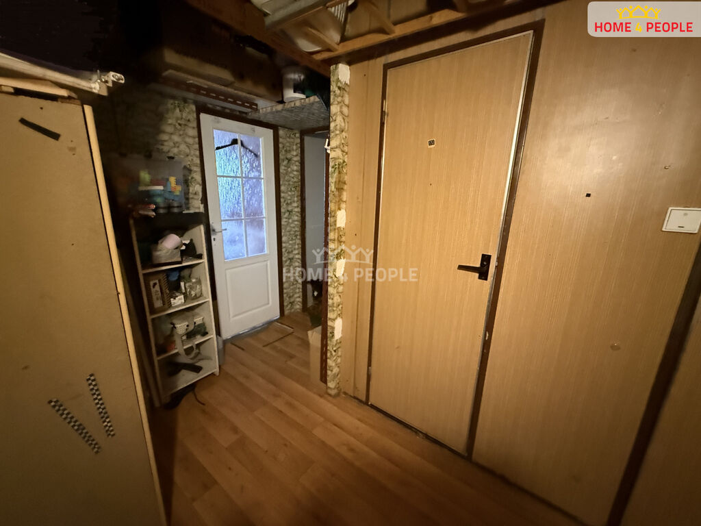 Dispozice je prakticky řešená: vcházíme do prostorné předsíně, ze které jsou vstupy do dvou pokojů i kuchyně, koupelny a samostatného WC. Dostatečný prostor pro uložení věcí umožňuje sklepní koje.