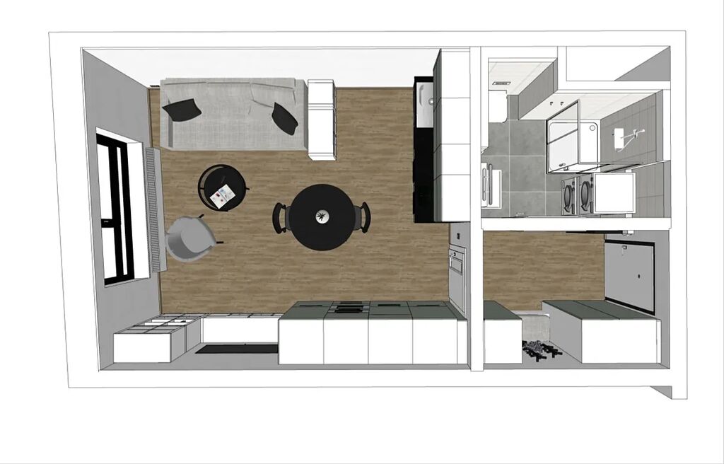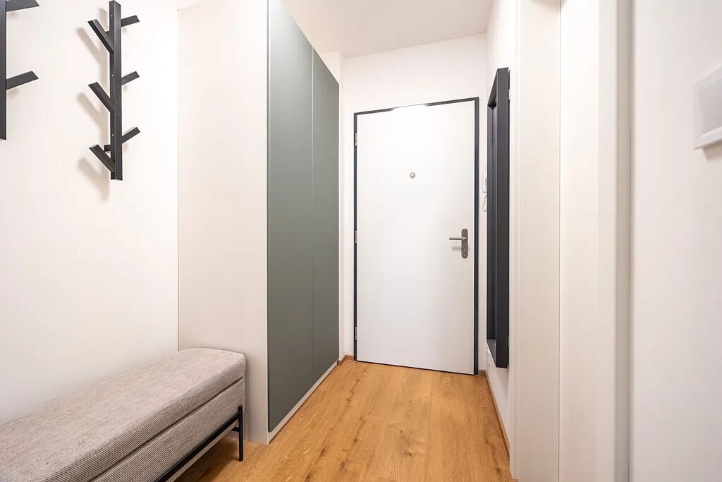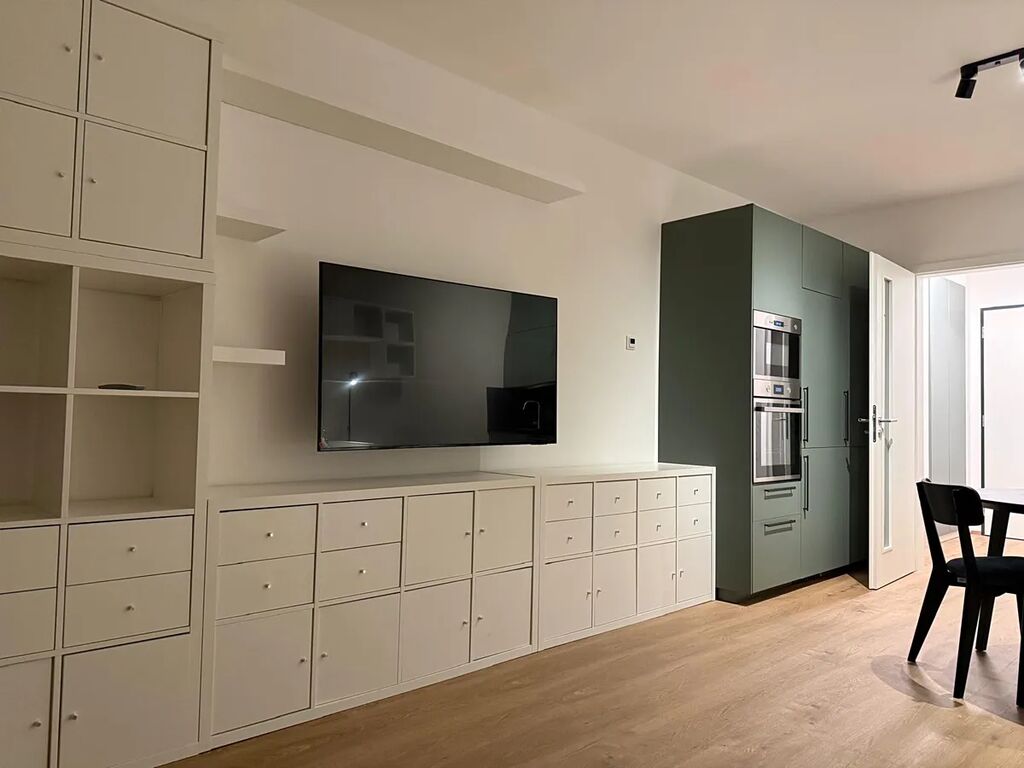 Kuchyňská linka IKEA na míru v nadčasové zelenošedé barvě, vestavné spotřebiče (myčka, trouba, mikrovlnná trouba, lednice s mrazákem), jídelní stůl se židlemi, rozkládací postel s úložným prostorem, TV Samsung, TV skříňky a úložné sestavy na míru. Stačí se nastěhovat.