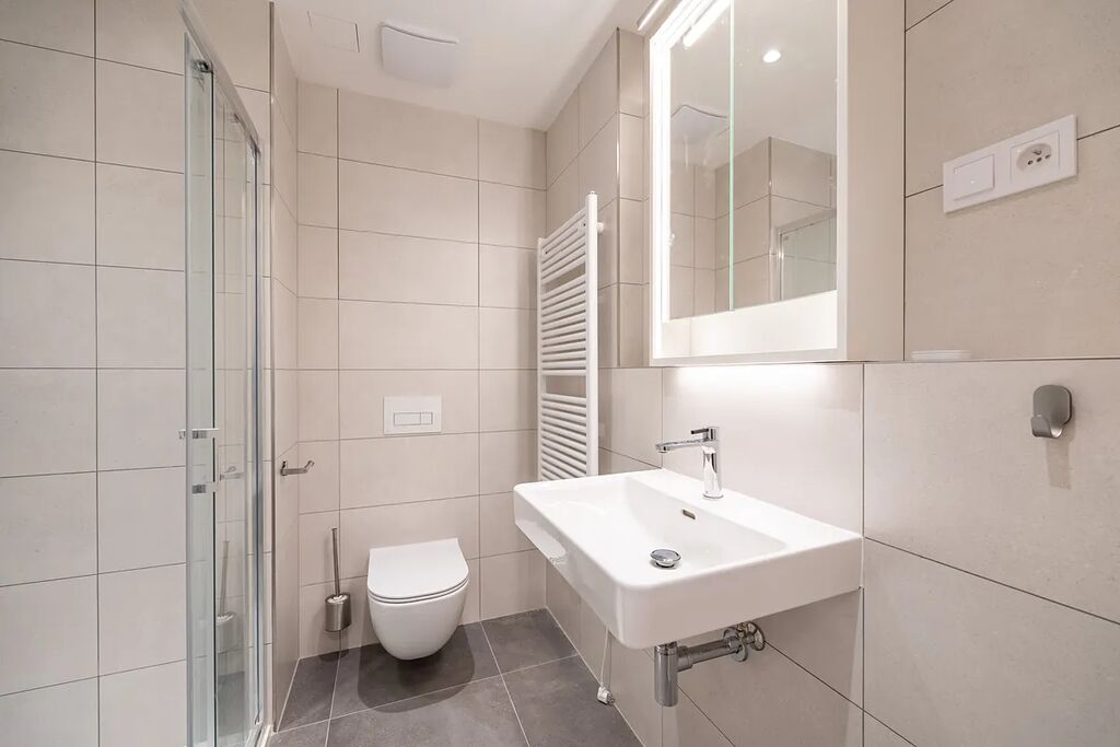 - koupelna se sprchovým koutem, toaletou a kombinovanou pračkou se sušičkou značky Haier.