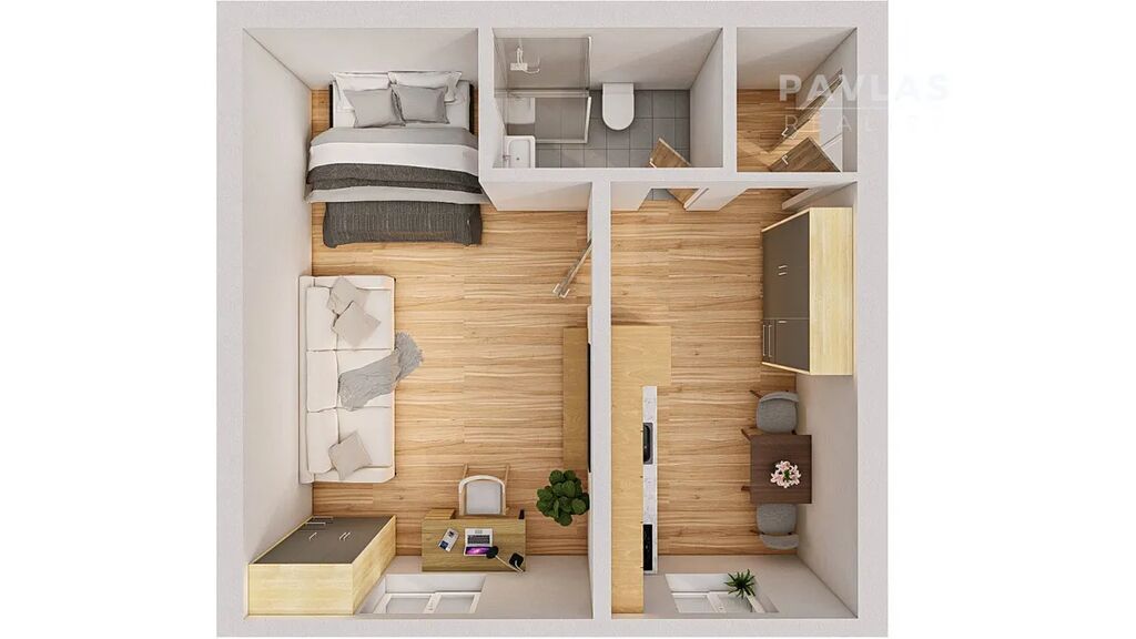 Byt č. 2 s rozlohou 36m² je jako stvořený pro jednotlivce nebo páry. Zbrusu nová kuchyňská linka, luxusní černo-bílá koupelna se sprchovým koutem, která ještě nebyla použita, designové dveře s černým kováním dodávající celému bytu nádech nadčasového designu.