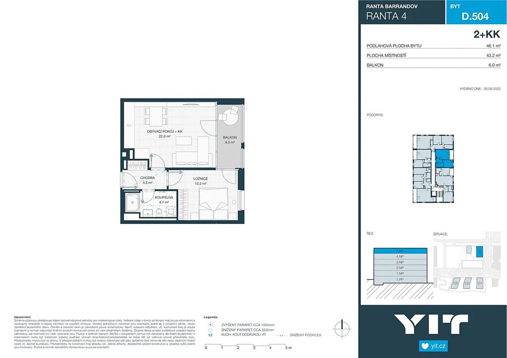 Byt 2+kk o celkové rozloze 46,1 m² je situován v 5.NP projektu RANTA Barrandov IV. Cena zahrnuje bytovou jednotku, sklepní kóji a DPH.