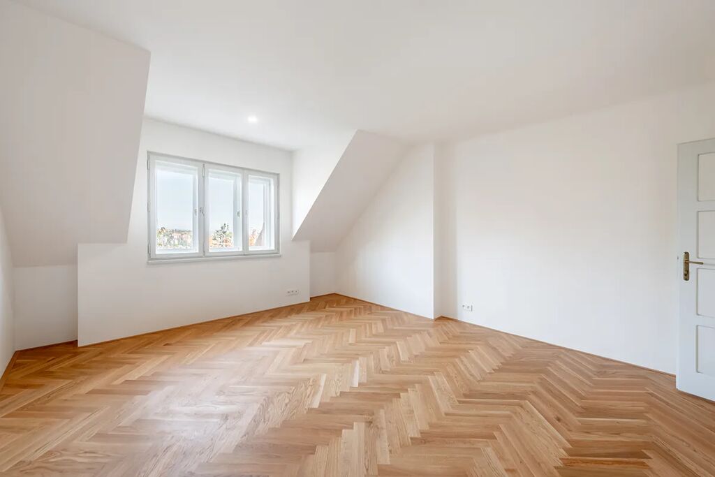 Přestože se byt nachází v podkroví, jeho interiér působí překvapivě civilně a komfortně. Architektonická práce s prostorem potlačuje obvyklé limity podkrovního bydlení – převládají rovné linie, plnohodnotná výška stropů a klasická okenní otvorová konstrukce. Byt je nově dokončen po kolaudaci a připraven k citlivému dotažení v individuálním interiérovém stylu nového majitele.