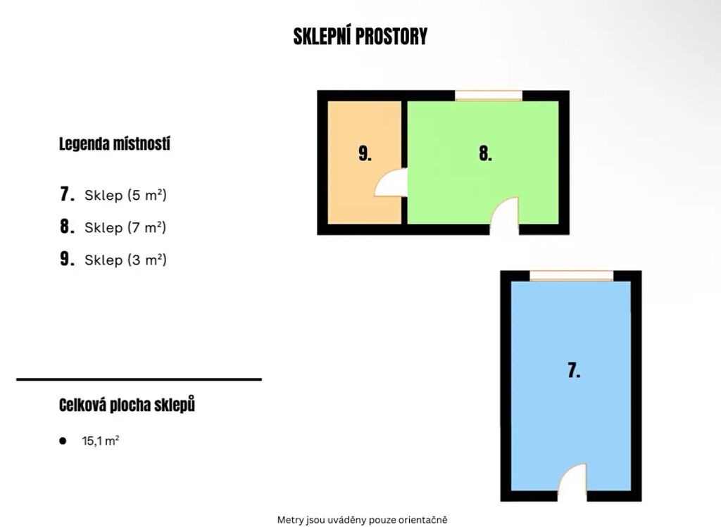 K bytu náleží dva prostorné sklepy (15,1 m²), ideální pro uskladnění kol, sportovního vybavení či sezónních věcí.