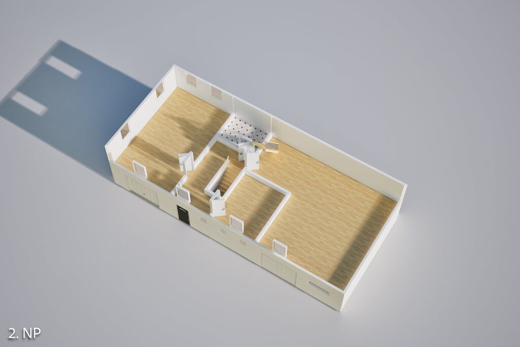 První nadzemní podlaží prošlo úpravami umožňujícími provoz autodílny, klempírny nebo jiného servisního či řemeslného provozu. Byly zde vybourány nové otvory pro plechová dvoukřídlá vrata, doplněny a vystavěny nové příčky, instalovány větrací mřížky a vytvořeno kompletní technické a hygienické zázemí včetně šaten, WC, sprchy, kanceláře a dalších místností. Prostory jsou připravené k okamžitému využití a lze je dále přizpůsobit konkrétním potřebám provozu.