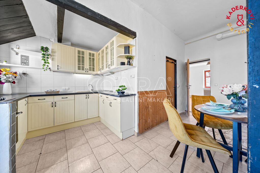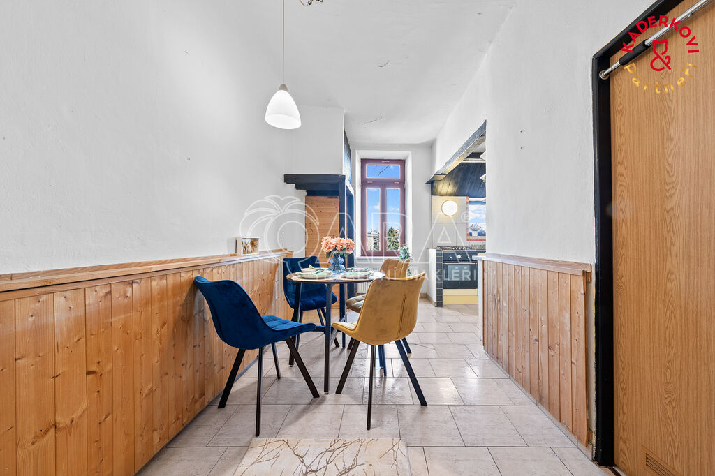 • Jídelna s kuchyní (15,16 m²) – orientovaná na západ směrem do vnitrobloku a zahrady