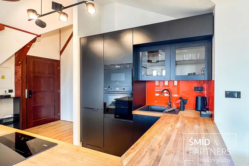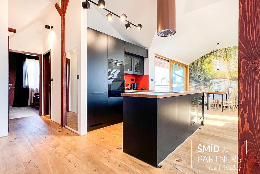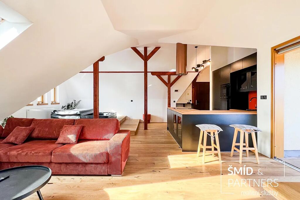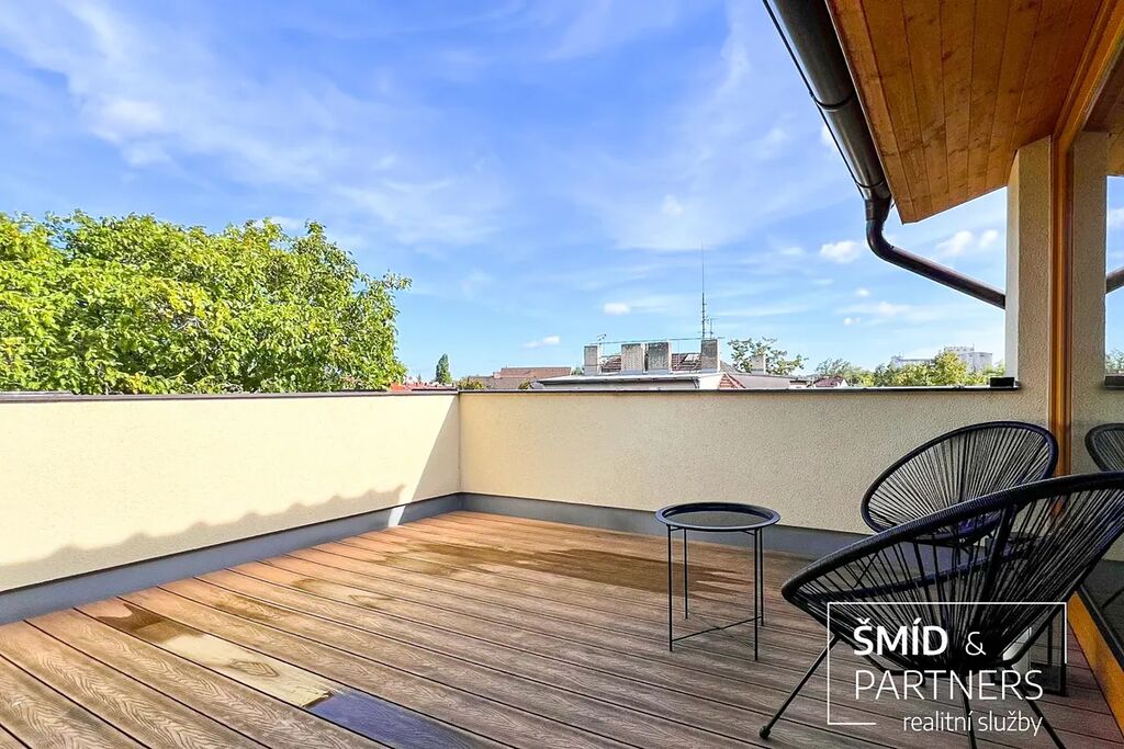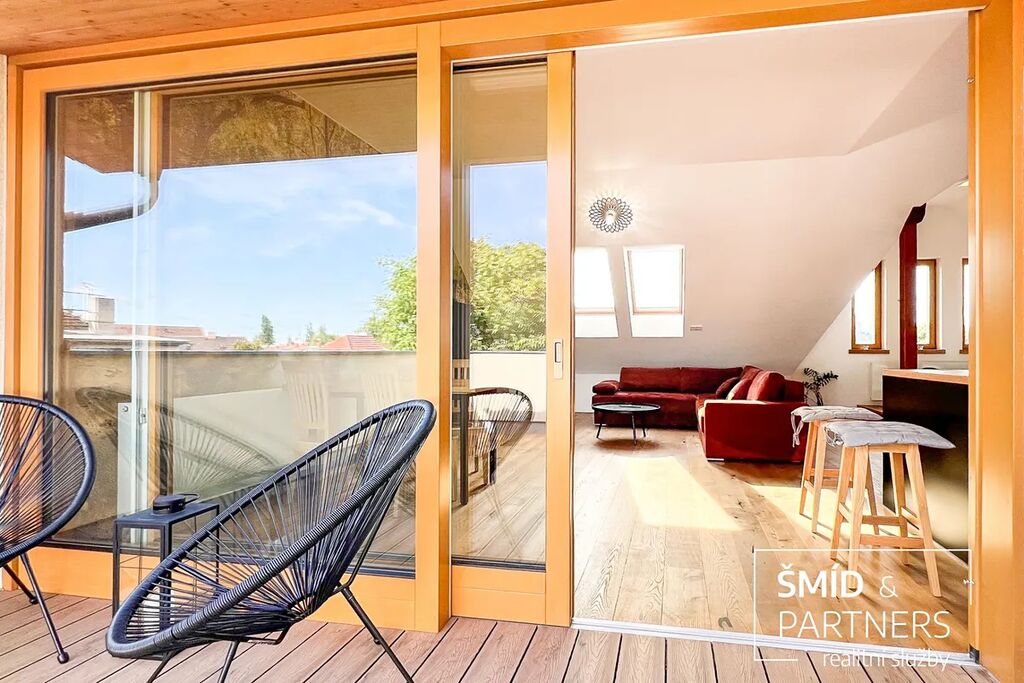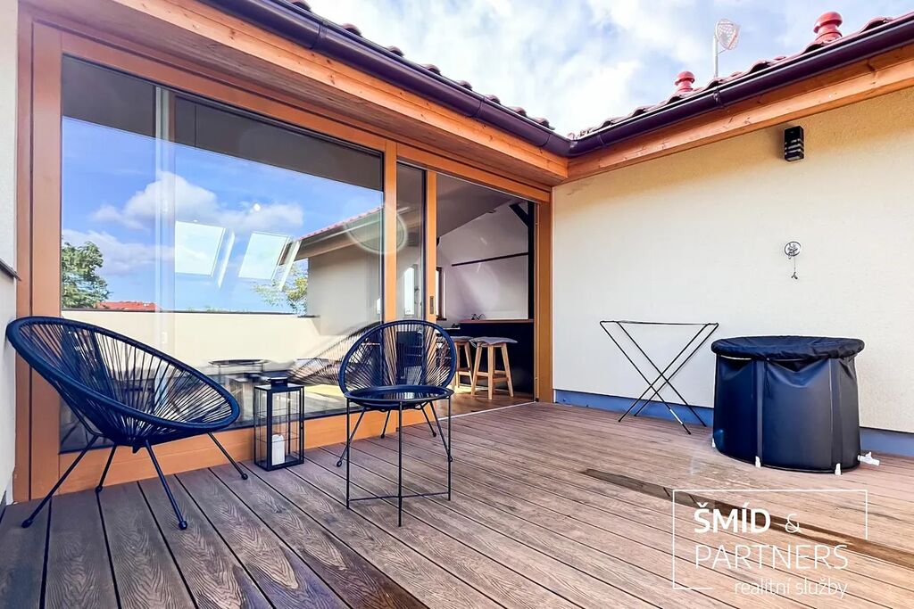 Tento podkrovní byt je luxusně vybaven moderní kuchyní, vířivou vanou, velkou terasou, prostorným obývacím prostorem, saunou a zahradou, která je k dispozici všem vlastníkům domu. Kuchyň je vybavena troubou, mikrovlnnou troubou, lednicí s mrazákem, indukcí a myčkou. Ve spolupráci s architektkou zde vnikl příjemný prostor k bydlení a zároveň místa pro relaxaci. Z terasy je výhled na zahradu, v jejíž zadní části je k dispozici pergola. Díky stromům a vyšším plotům zde můžete strávit čas v poklidu a relativně v soukromí.