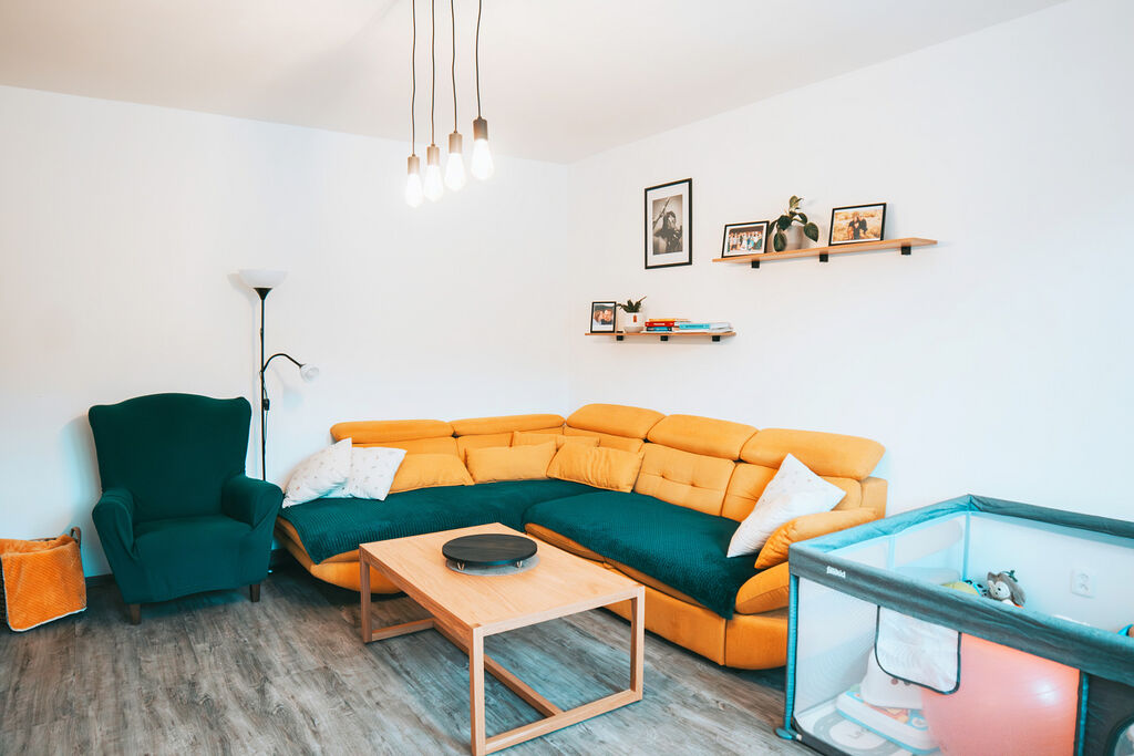 Dispozice bytu je praktická a vzdušná – z prostorné chodby se dostanete do ložnice, dětského pokoje, koupelny, samostatného WC a obývacího pokoje propojeného s moderní kuchyní. Orientace na východ a západ zajišťuje dostatek denního světla po celý den.