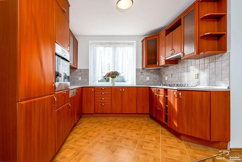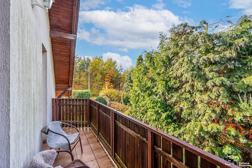 Dispozice domu je 7+kk. V přízemí se nachází chodba s vestavěnými skříněmi a prostornou komorou, v levém křídle domu je obytná místnost s kuchyní, jídelním arkýřem a pokojem s krbem, odkud se dá vyjít francouzskými dveřmi do zimní zahrady, v pravém křídle přízemí je koupelna se sprchovým koutem, samostatná wc a 2 pokoje vhodné na pracovnu nebo ložnici.V 1.patře se nachází 4 pokoje s dostatkem vestavěných skříní, 2 ložnice mají přístup na západně orientovanou terasu, prostorná koupelna s jacuzzi vanou a samostatná toaleta.