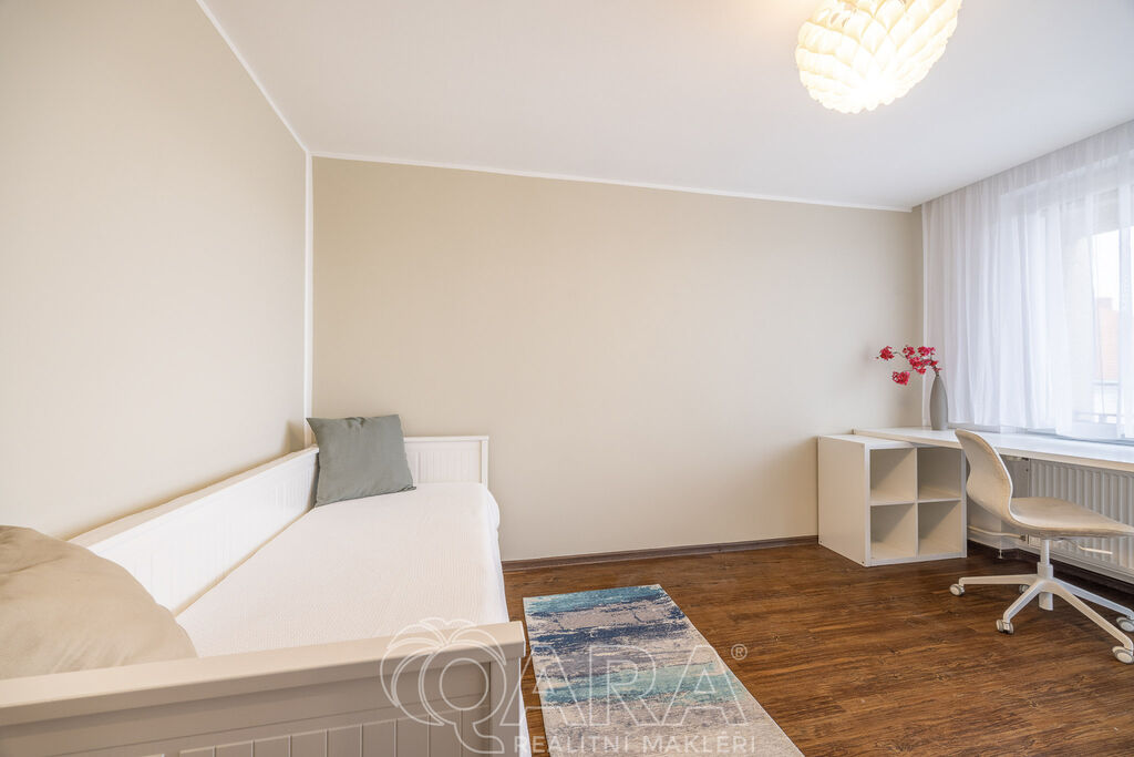 Druhá ložnice/pracovna/dětský pokoj má taktéž přímý vstup na lodžii a je zde jednolůžko, moderní nábytková sestava se šatní skříní a velký pracovní stůl.