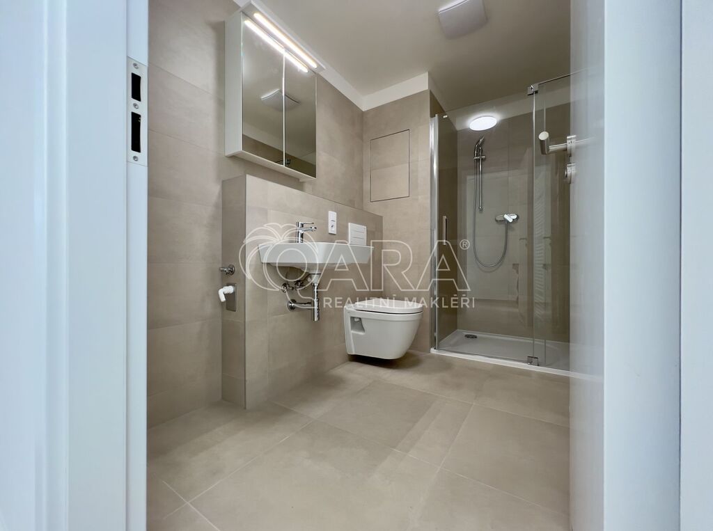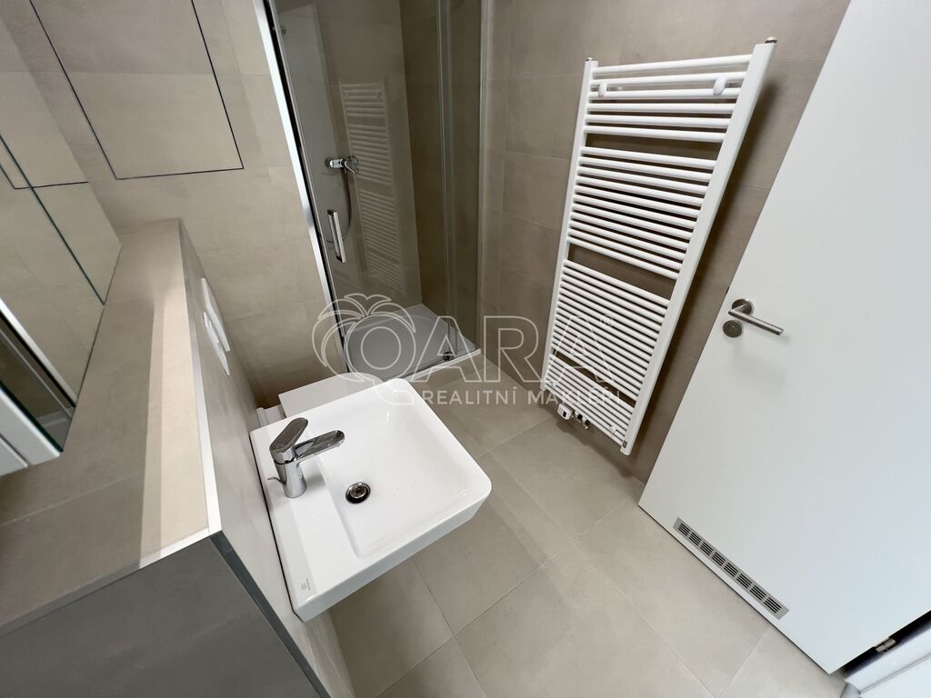 Bytová jednotka o ploše 34,7 metrů čtverečních se nachází ve 4. nadzemním podlaží novostavby z roku 2023 (výtah je samozřejmostí). Byt se skládá z předsíně, ze které se dostaneme do obytné části o výměře 23 metrů čtverečních, která je zařízena kuchyňskou linkou s elektrickou troubou, dvouplotýnkovou indukční varnou deskou a digestoří (další spotřebiče nebudou součástí nájmu). Z obytné části je přístupný balkon o výměře 4,4 metrů čtverečních. Koupelna společně s WC je přístupná také z předsíně a je vybavena sprchovým koutem, umyvadlem, zrcadlem a splachovacím WC. Přípojka na pračku a dostatek místa na sušičku je samozřejmostí. Byt se pronajímá jako nezařízený, tudíž si jej můžete vybavit podle svých vlastních představ. K dispozici je i samostatný sklep a kryté parkovací stání pro jedno auto (není podmínkou nájmu).