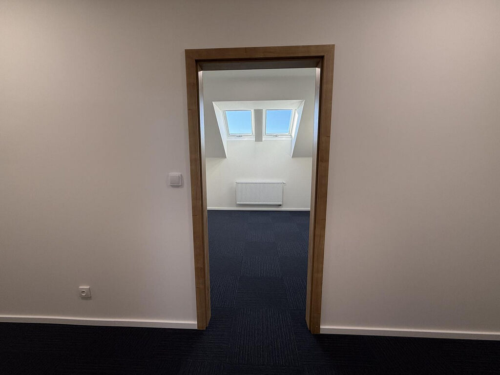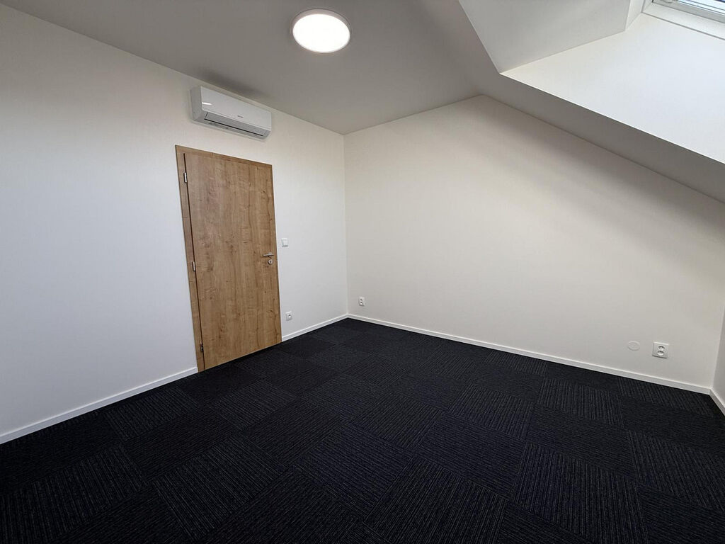 Do objektu vstupujeme přes prostornou vstupní halu v přízemí o výměře cca 17,22 m². Z této haly vede schodiště do 1. patra, kde se nachází samotná kancelář o výměře cca 12,90 m². Kancelář je klimatizována. Místnost je prosvětlena dvěma střešními okny, které zajišťují dostatek denního světla. K dispozici jsou elektrické zásuvky a husí krk pro natažení internetu nebo kabeláže dle potřeby nájemce. Patro disponuje společnými prostory, které zahrnují vstupní halu o výměře cca 17,79 m². Součástí haly je také kuchyňka o výměře cca 1,60 m², která je vybavená lednicí, mikrovlnou troubou. Na patře se nachází také WC o výměře 1,26 m² a 2,11 m². Jednotlivé kanceláře spojuje chodba o celkové výměře cca 23,70 m².