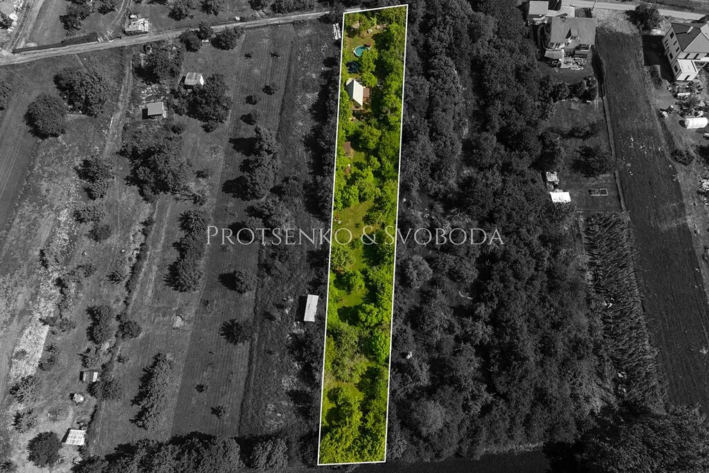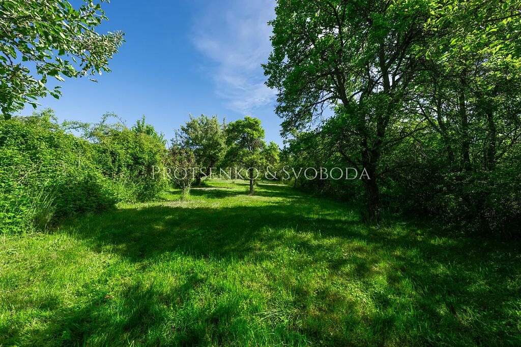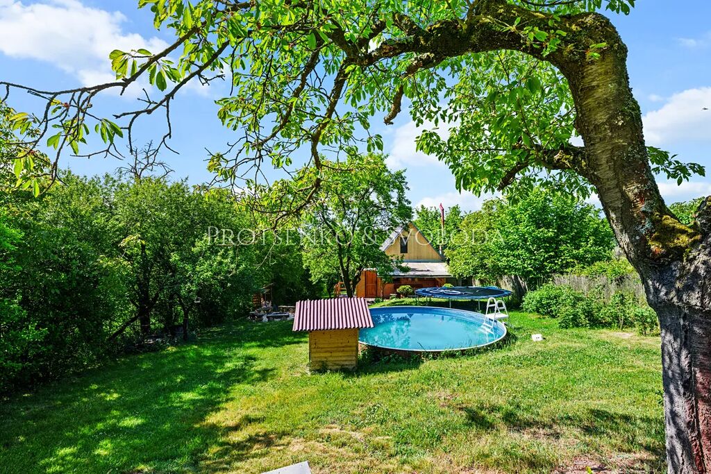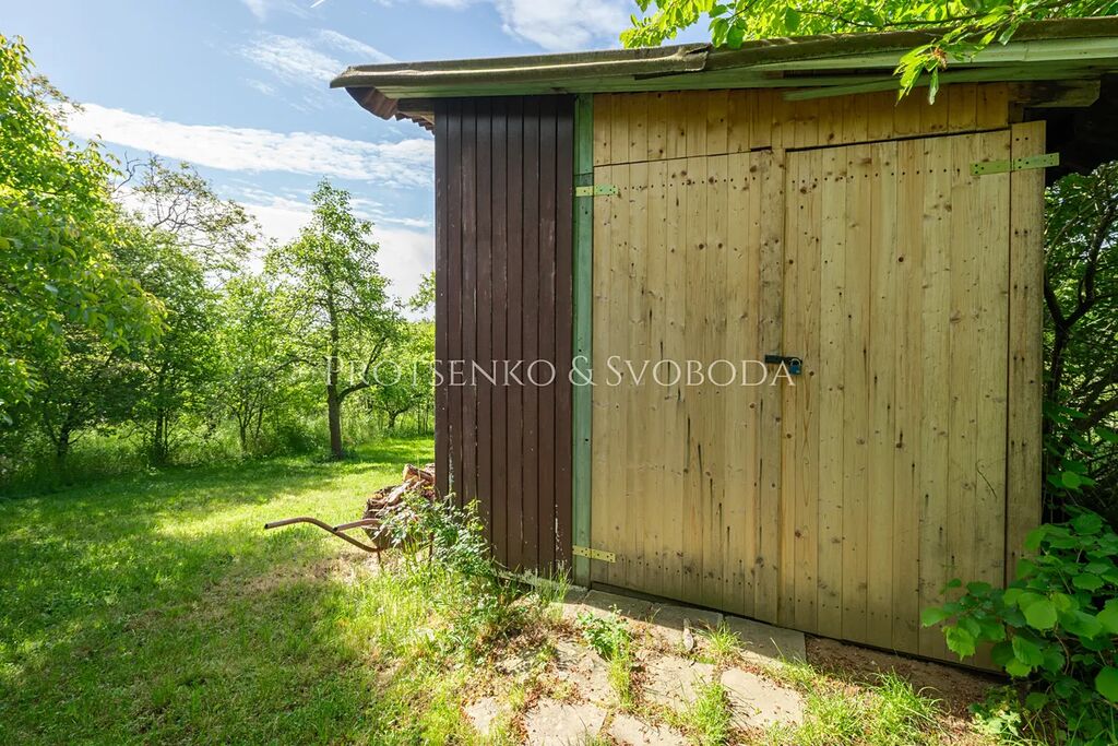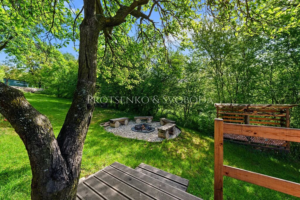 Pozemek je obklopen vzrostlou zelení a nabízí soukromí i výhledy do přírody. Nachází se zde bazén s pískovou filtrací(průměr 4,6 m, částečně zakopaný ve svahu), trampolína (průměr 4,3 m, bez sítě), ohniště se sezením z masivního kamene a bohatě osázený sad – třešně, jabloně, hrušně, švestky, ořechy (vlašské i lískové), ale také šípky, lesní jahody a medvědí česnek. Sad nebyl chemicky ošetřován a je tak ideálním základem pro přírodní zahradničení či dětské hry.