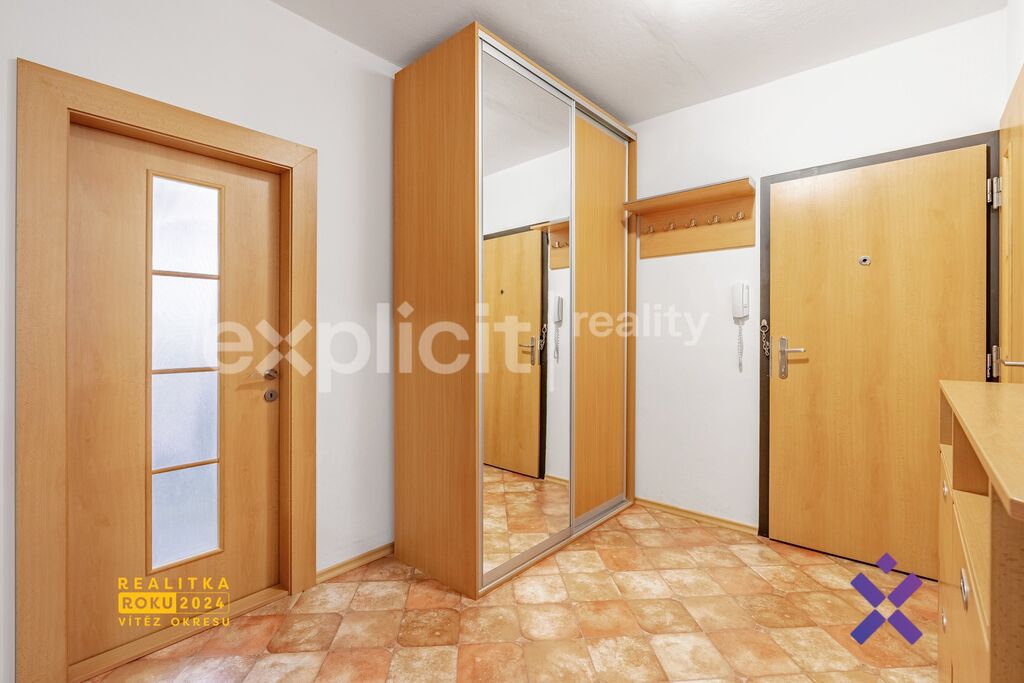 Po vstupu do bytu se ocitnete v prostorné chodbě vybavené velkou skříní, komodou, botníkem a další skříňkou - tyto prvky poskytují dostatek úložného prostoru pro celou rodinu. Z chodby je vstup do všech místností.