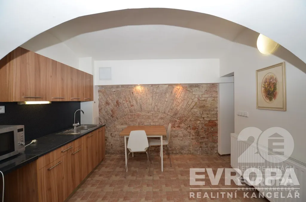 Celý nebytový prostor je citlivě zrekonstruovaný se zachováním původních prvků kamenného a cihlového zdiva. Skládá se ze vstupní prostorné chodby, s místem na psací stůl, skříně atd., dále velká místnost s kuchyňským koutem, průchod do chodbičky, kde je koupelna se sprchou a samostatné wc a dále menší místnost, která má snížený podhled (výška stropu cca 165cm, tato místnost není zahrnutá v uvedené ploše) Na podlahách je praktická dlažba.