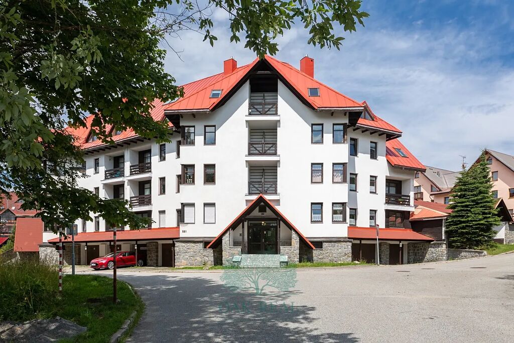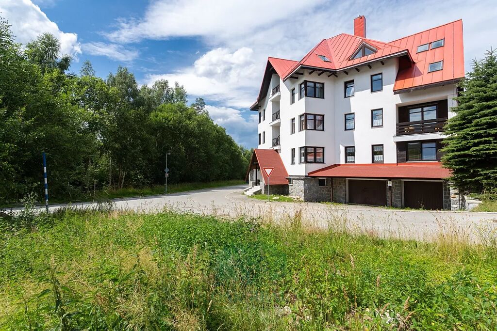 Apartmánový dům byl postaven na rozhraní milénia stranou od rušného centra Harrachova v lokalitě Nový Svět. Apartmán se nachází v rohové části komplexu. Vévodí mu chodba, která prochází celým bytem. Ihned u vchodu je po levé straně koupelna s vanou, toaletou a dostatkem místa pro sušení lyžařské výbavy. Následuje vybavená kuchyně s jídelním pultem a malou lodžií, která v létě slouží jako spíž a v zimě jako velká přírodní lednice. Na konci chodby se nachází dva pokoje. Ty jsou vybaveny francouzskými okny na samostatné lodžie. Jeden pokoj má lodžii orientovanou na sever do vnitrobloku se stromy. Druhý pokoj má lodžii orientovanou na jih s překrásným výhledem na Čertovu horu a skokanské můstky, které jsou dominantou Harrachova.