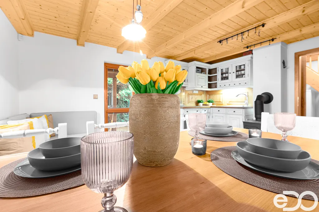 Chata je dvoupodlažní se sklepem a krytou terasou. V přízemí se nachází obytná část s předsíní, moderní kuchyňskou linkou a spotřebiči, koupelna a útulný obývací prostor. V patře se nachází dvě ložnice. Interiér je plně vybavený vestavěným nábytkem na míru. Chata má zabezpečovací systém, vlastní studnu, jímku, podlahové topení a otopný žebřík v koupelně, ale je také možné topit pomocí kamen na dřevo.