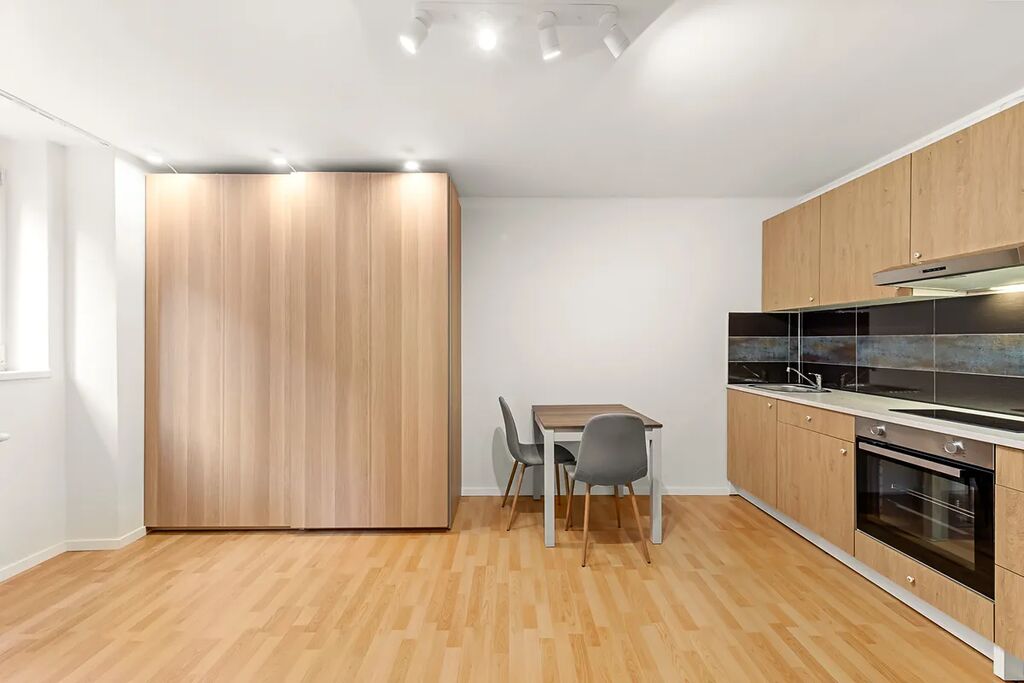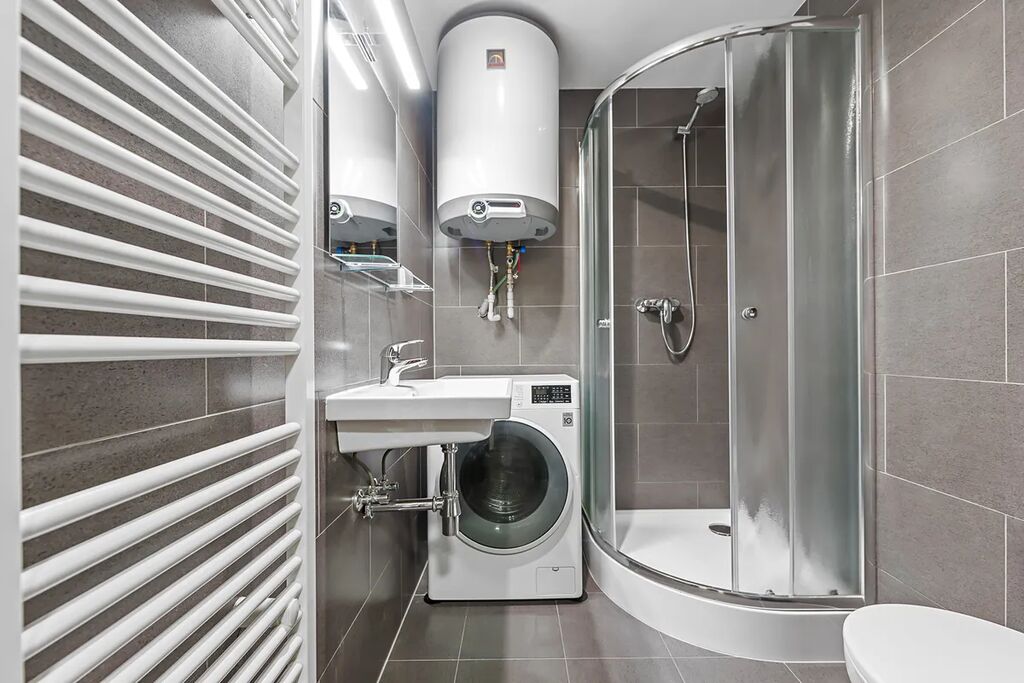 Součástí vybavení je kuchyňská linka včetně spotřebičů, pračka a dostatek úložných prostor.