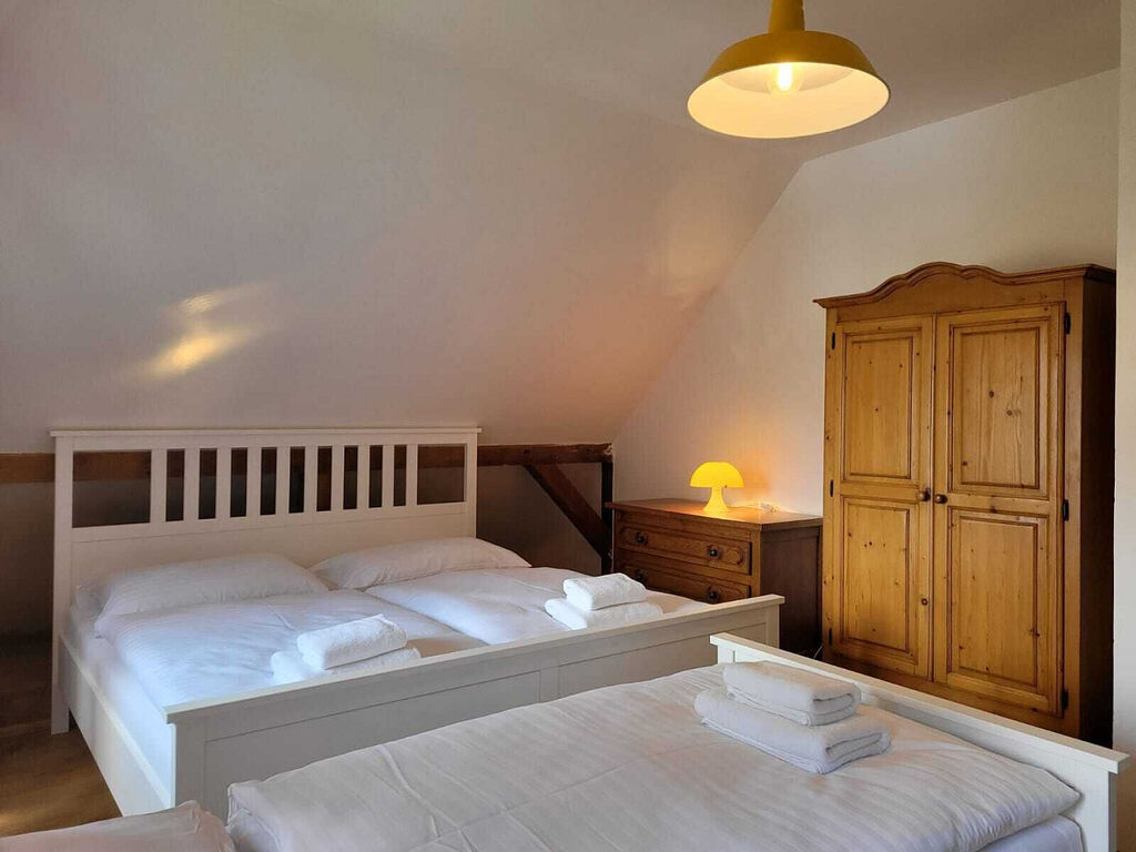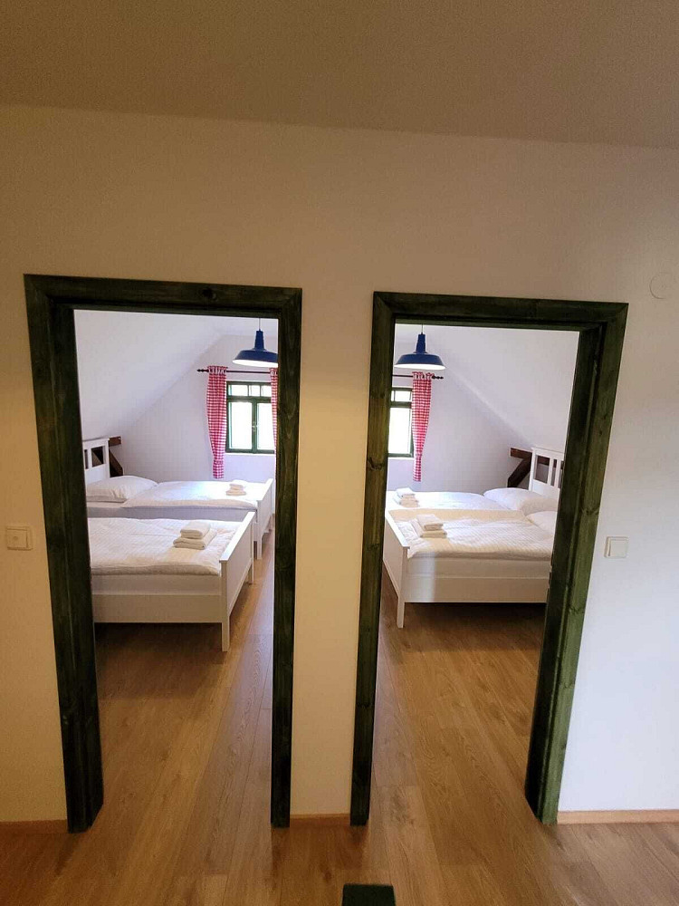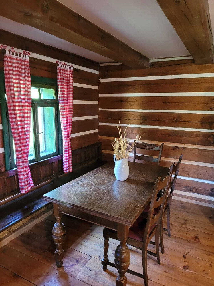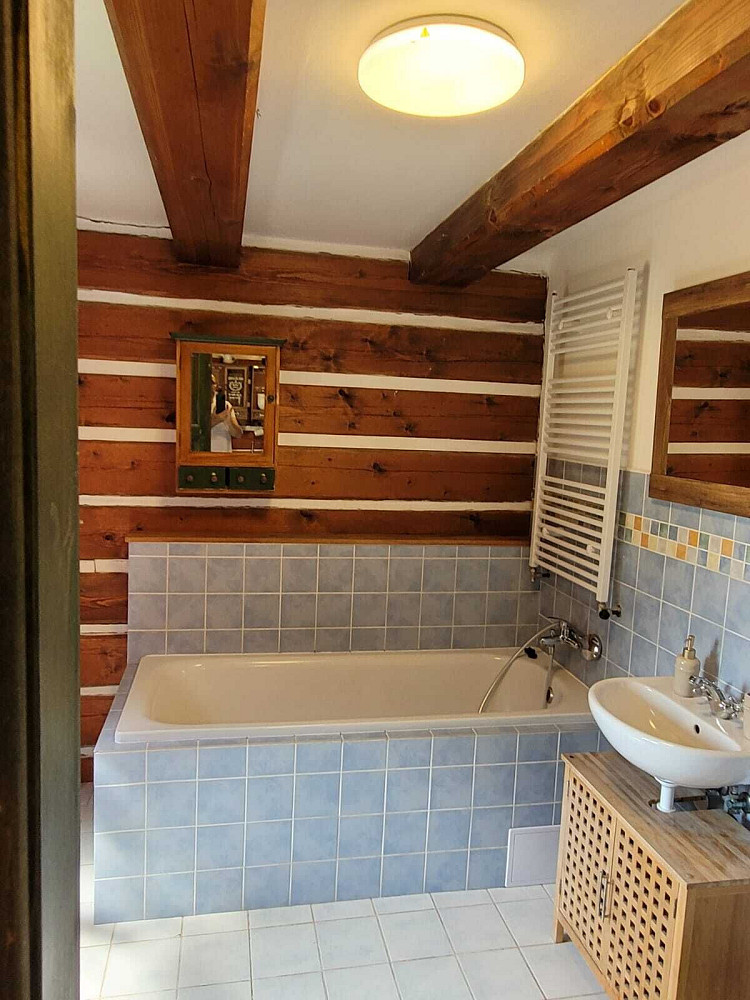 Přízemí roubenky nabízí obývací prostor, kuchyňský kout s kompletním vybavením včetně lednice a mikrovlnné trouby a 1 koupelnu. Koupelna je vybavená vanou. K dispozici jsou tři samostatné ložnice v patře. Vytápí se kamnama, případně je zde elektrický kotel, jako doplňkové topení.