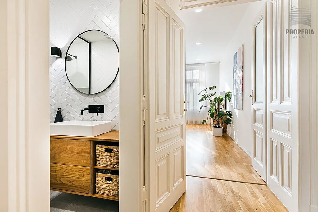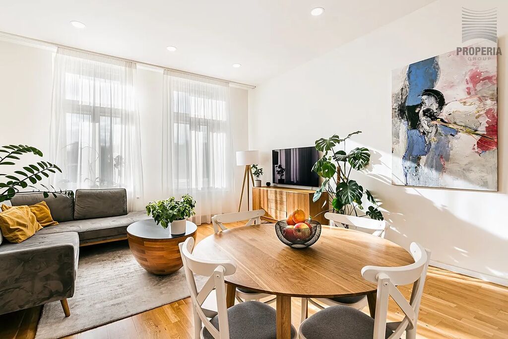 Dominantou bytu je velkorysý obývací pokoj propojený s kuchyní a jídelnou. Atmosféru podtrhuje přirozené světlo proudící skrze vysoká okna, doplněná o elegantní textilie. Dubové podlahy a světlé tóny stěn vytvářejí klidný, nadčasový základ, který padne každému stylu. Komfort v letních měsících zajišťuje klimatizace.
