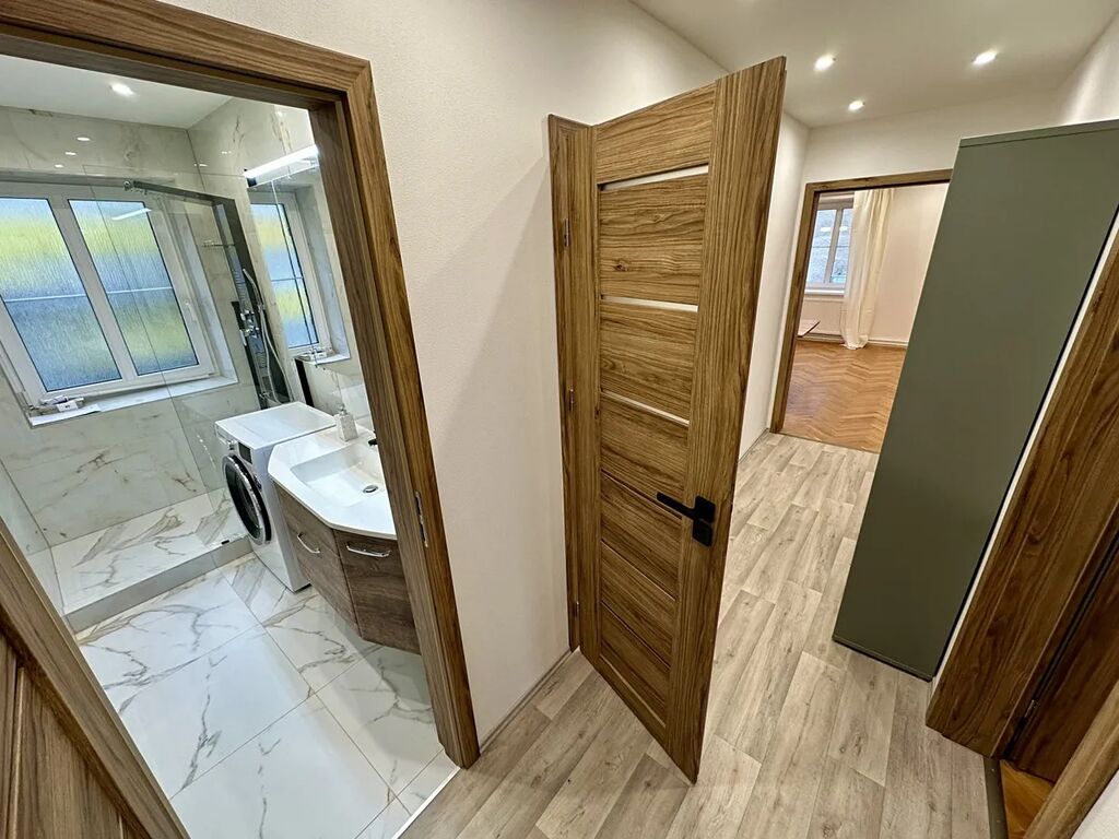Nabízíme ke koupi světlý a prostorný byt 4+1 o velikosti 78 m² v osobním vlastnictví, který se nachází ve druhém patře cihlového domu v klidné části Tanvaldu. Byt prošel kompletní rekonstrukcí – nové elektrické rozvody, vodoinstalace, zateplené a snížené stropy s moderním bodovým osvětlením – a působí velmi útulně a vzdušně. Dispozice zahrnuje tři samostatné pokoje a obývací pokoj propojený s jídelnou a kuchyní, dále technickou místnost s bojlerem a novým elektrickým kotlem, koupelnu se sprchovým koutem a samostatné WC. V pokojích zůstaly původní dřevěné parkety, ostatní prostory mají dlažbu či PVC. Součástí vybavení je americká lednice Concept, myčka Whirlpool, sporák s troubou, digestoř a pračka Beko. K bytu náleží sklep i půda, okolí domu nabízí zahradu ve správě města, kterou lze využívat k odpočinku či věšení prádla.