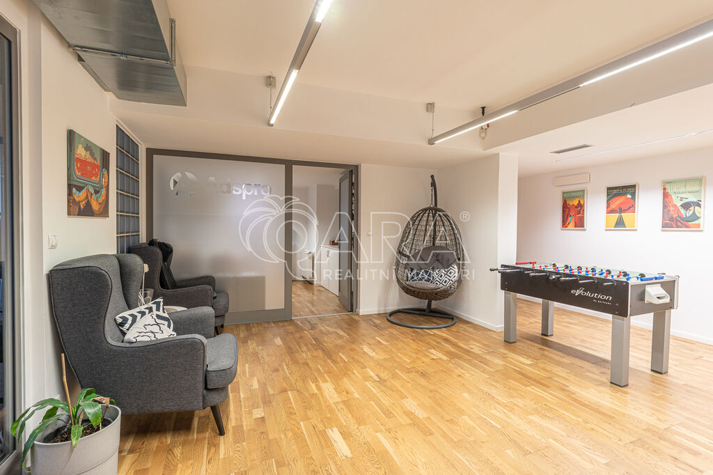 Prostor o celkové rozloze kanceláří 335 m² je plně klimatizovaný. Dispozice nabízí dvě větší otevřené místnosti, dvě místnosti oddělené skleněnou stěnou, přičemž jedna z nich má vstup na terasu o velikosti 17 m², samostatnou uzavřenou místnost, zasedací místnost a prostor pro recepci či posezení návštěv. Zázemí zahrnuje kuchyňku, jídelní kout, 2x moderní sociální zařízení se sprchou, serverovnu a úklidovou místnost.
