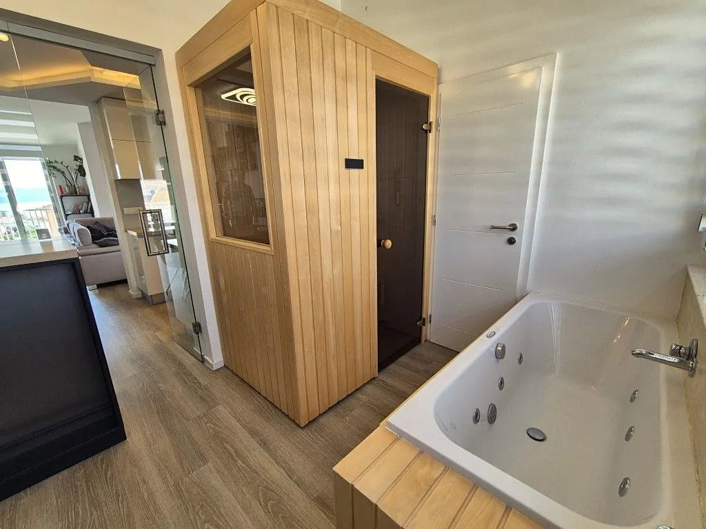 Apartmán se nachází ve 3. patře rezidenční budovy a má vyvýšené mezipatro. Sestává ze vstupní chodby, koupelny, WC, 2 ložnic, komory, relaxačního prostoru se saunou a vířivkou a kuchyně s jídelnou a obývacím pokojem s přístupem na lodžii s částečným výhledem na moře. Vyvýšené mezipatro může sloužit jako další ložnice, nyní se používá jako pracovna a odpočinkový prostor s úložným místem.