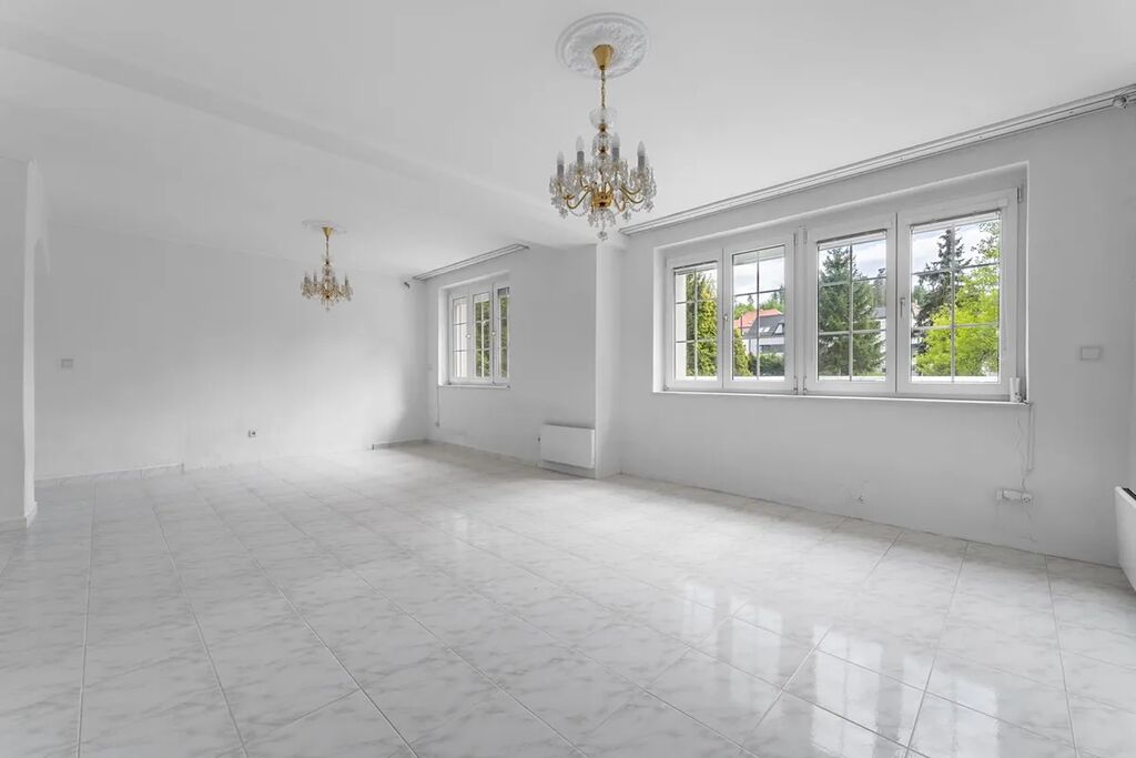 Přízemí: Prostorný obývací pokoj, jídelna, kuchyň, spíž, zimní zahrada s přímým vstupem na terasu, koupelna a technická místnost. Podlahy tvoří praktická dlažba v šedobílém provedení.