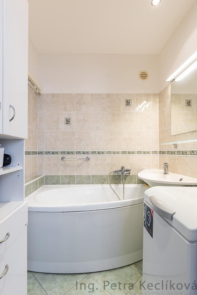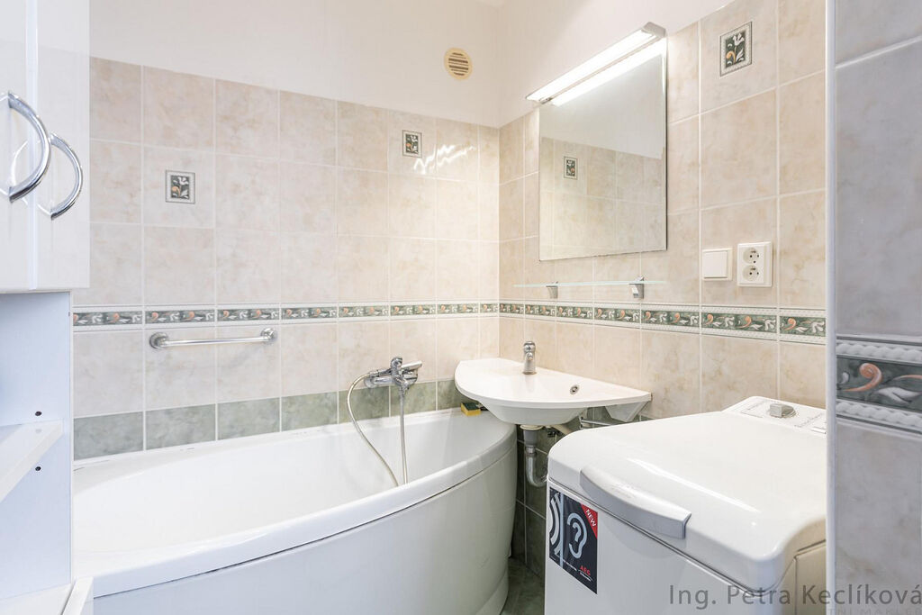 Koupelna je vybavena vanou a pračkou AEG LAVAMAT s vrchním plněním model 47330, toaleta je samostatná. Na balkóně je k dispozici stolek a dvě skládací židle.