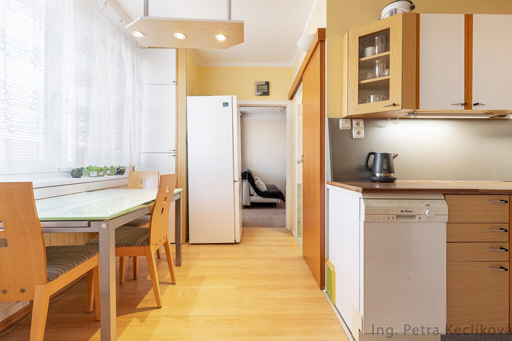 Kuchyně je plně vybavena (Kávovar kapslový Nespresso, Varná konvice Philips, Myčka ROMO, Plynová deska MORA, Trouba elektrická MORA EVP351-423I, digestoř, Mikrovlnka s grilem Whirlpool VIP20) a nabízí dostatek prostoru k vaření. V části jídelní je plovoucí podlaha v části u kuchyňské linky dlažba. Je zde též jídelní stůl se čtyřmi židlemi.