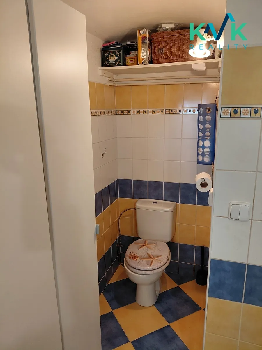 Přízemí domu je přístupné dvěma vchody, jedním ze zahrady vedle pergoly do chodby mezi prostornou kuchyní a obývacím pokojem s krbovými kamny s výměníkem a rozvody do topného obvodu, která pokračuje dále do koupelny, technické místnosti s elektrickým kotlem, bojlerem a soustavou polic a končí zádveřím s vchodem z boku nemovitosti.