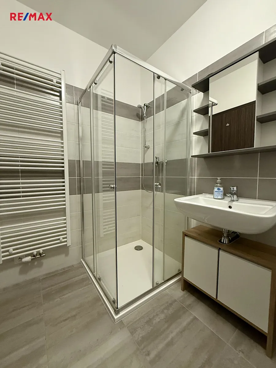 • koupelna se sprchovým koutem, toaletou, topným žebříkem a pračkou