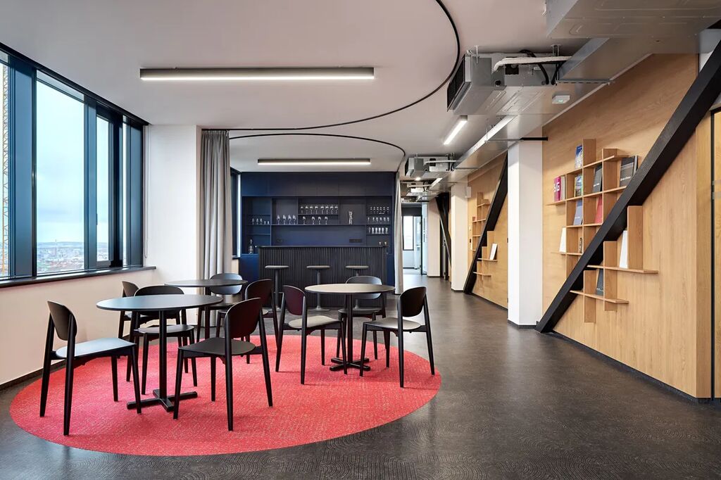 Nadčasově navržený interiér nabízí kombinaci open space kanceláří, samostatných pracovních místností, jednacích prostor, a nechybí ani „Meeting Point“ s kuchyňkou, sociální zařízení a sprchy.